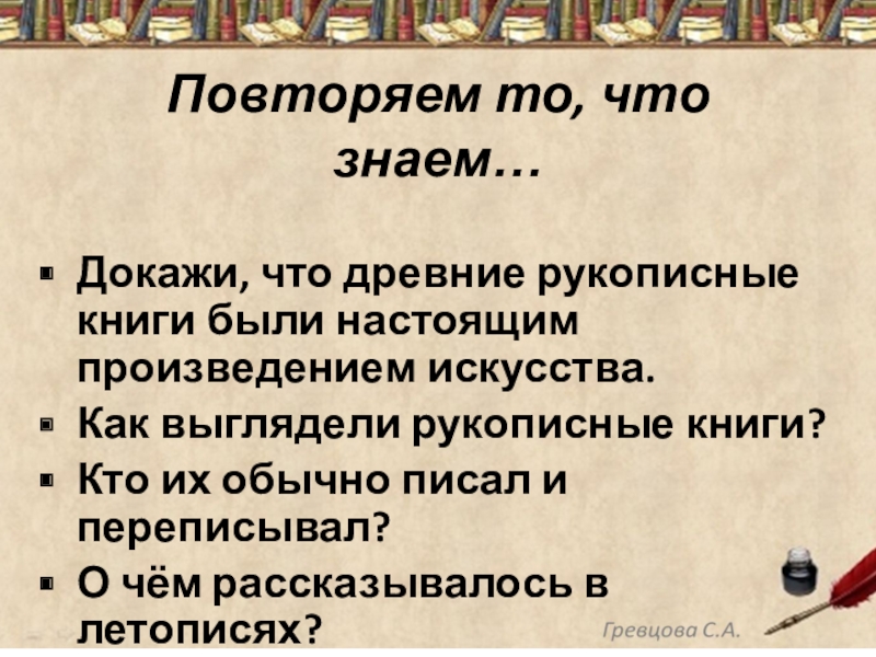 Повторяем то, что знаем…Докажи, что древние рукописные книги были настоящим произведением искусства.Как выглядели рукописные книги?Кто их обычно