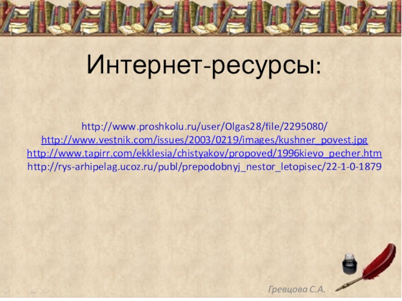 http://www.proshkolu.ru/user/Olgas28/file/2295080/ http://www.vestnik.com/issues/2003/0219/images/kushner_povest.jpg http://www.tapirr.com/ekklesia/chistyakov/propoved/1996kievo_pecher.htm http://rys-arhipelag.ucoz.ru/publ/prepodobnyj_nestor_letopisec/22-1-0-1879Интернет-ресурсы: