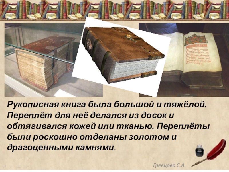 Слайд 4Рукописная книга была большой и тяжёлой. Переплёт для неё делался из