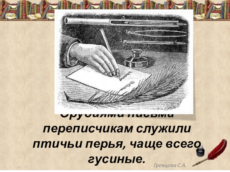 Слайд 6Орудиями письма переписчикам служили птичьи перья, чаще всего гусиные.