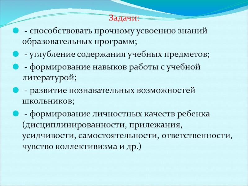 - формирование личностных качеств ребенка (дисциплинированности, прилежания, усидчивости, самостоятельности, ответственности, чувство коллективизма и др.)