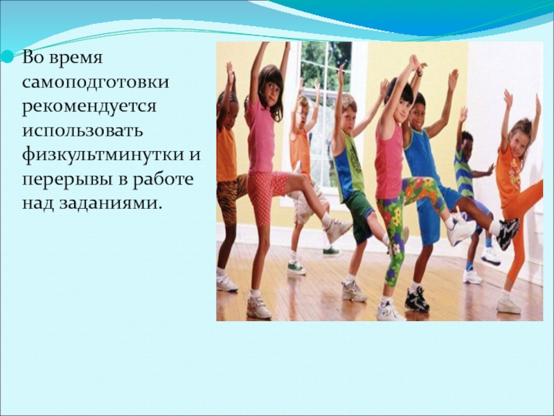 Слайд 19Во время самоподготовки рекомендуется использовать физкультминутки и перерывы в работе над