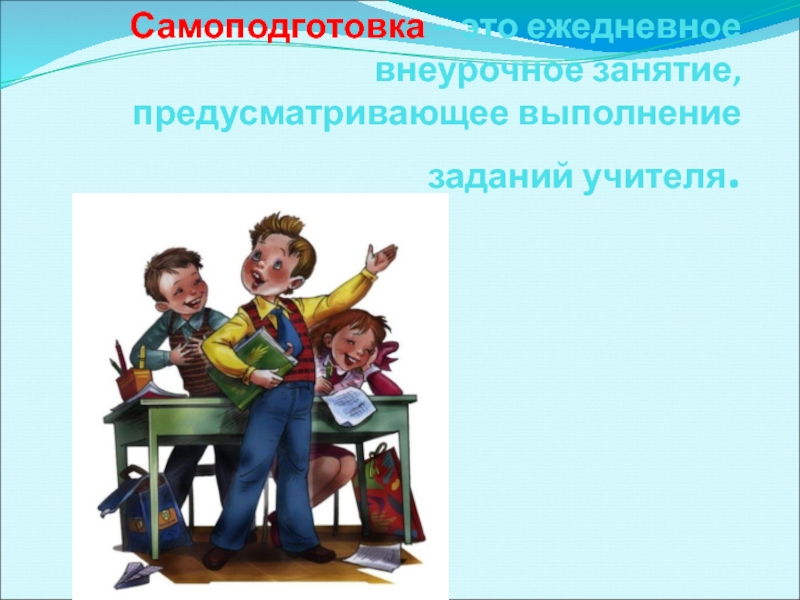 Слайд 2Самоподготовка – это ежедневное внеурочное занятие, предусматривающее выполнение заданий учителя.