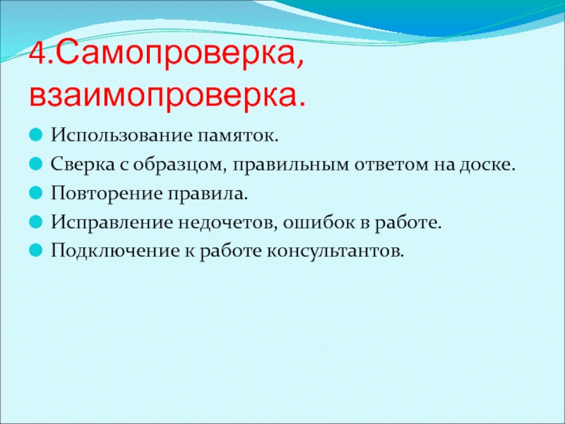 На этом этапе самоподготовки важно предоставить учащимся возможность самостоятельно проанализировать результаты своей деятельности.