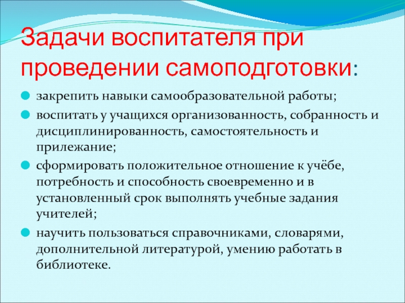 Слайд 5Задачи воспитателя при проведении самоподготовки:
