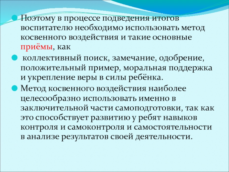 Слайд 22Поэтому в процессе подведения итогов воспитателю необходимо использовать метод косвенного воздействия