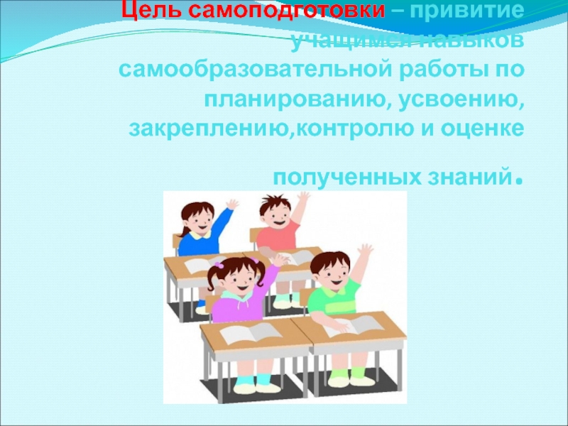 Слайд 3Цель самоподготовки – привитие учащимся навыков самообразовательной работы по планированию, усвоению,