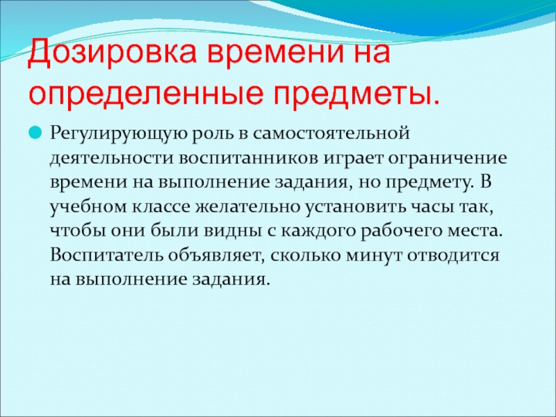ограничение времени на выполнение задания, но предмету. В учебном классе желательно установить часы так, чтобы они были видны с каждого рабочего места. Воспитатель объявляет, сколько минут отводится на выполнение задания.