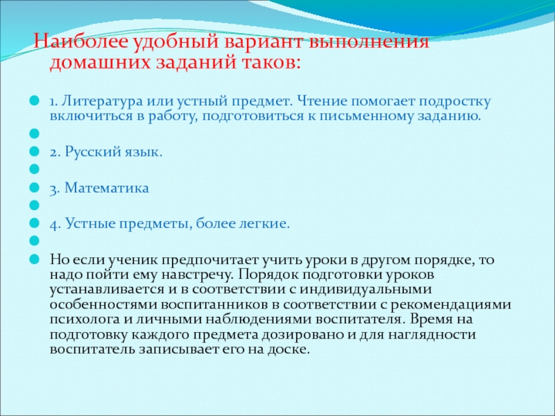 Но если ученик предпочитает учить уроки в другом порядке, то надо пойти ему навстречу. Порядок подготовки уроков устанавливается и в соответствии с индивидуальными особенностями воспитанников в соответствии с рекомендациями психолога и личными наблюдениями воспитателя. Время на подготовку каждого предмета дозировано и для наглядности воспитатель записывает его на доске.