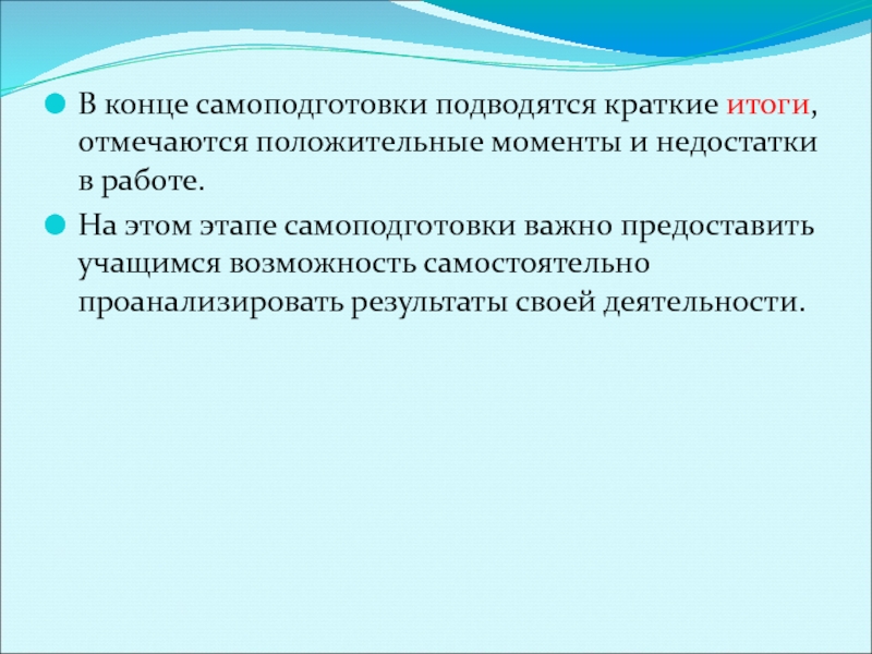 Слайд 21В конце самоподготовки подводятся краткие итоги, отмечаются положительные моменты и недостатки