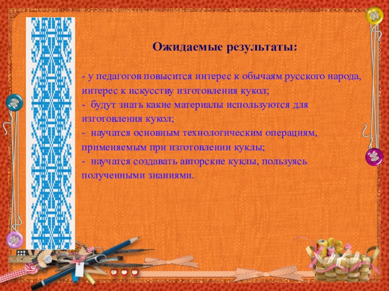 Ожидаемые результаты: - у педагогов повысится интерес к обычаям русского народа, интерес к искусству изготовления кукол;- будут знать