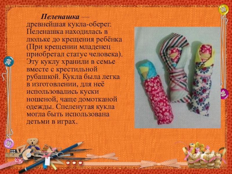 Пеленашка — древнейшая кукла-оберег. Пеленашка находилась в люльке до крещения ребёнка (При крещении младенец приобретал статус человека).
