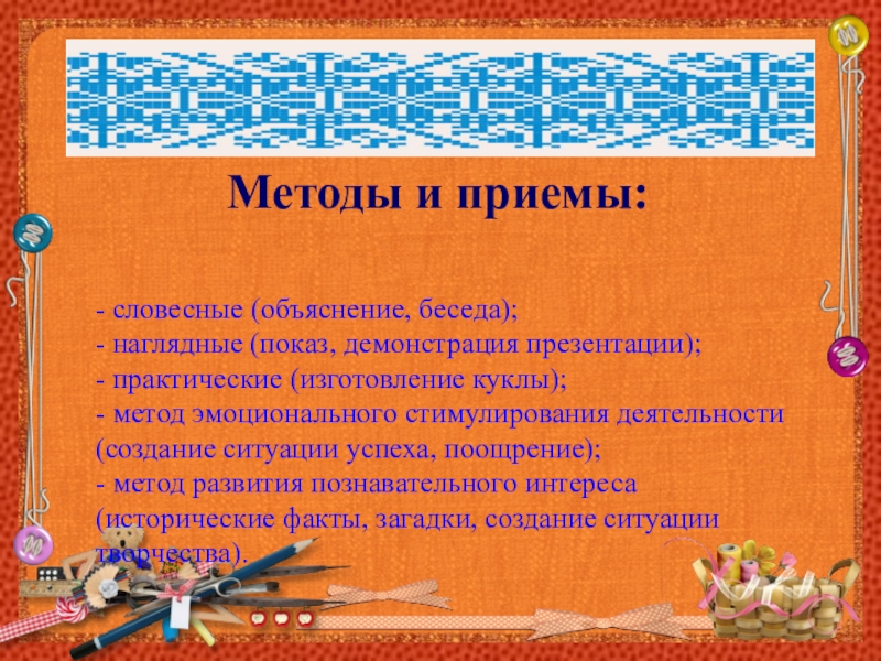 Методы и приемы:- словесные (объяснение, беседа);- наглядные (показ, демонстрация презентации);- практические (изготовление куклы);- метод эмоционального стимулирования деятельности