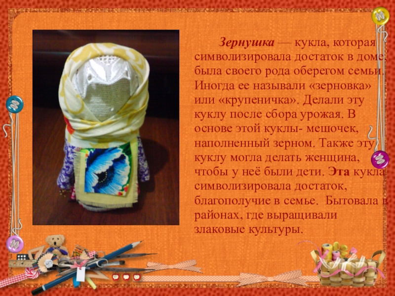 Слайд 6 Зернушка — кукла, которая символизировала достаток в доме, была своего рода