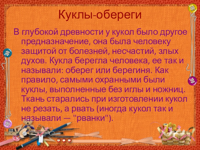 защитой от болезней, несчастий, злых духов. Кукла берегла человека, ее так и называли: оберег или берегиня. Как правило, самыми охранными были куклы, выполненные без иглы и ножниц. Ткань старались при изготовлении кукол не резать, а рвать (иногда кукол так и называли — "рванки").