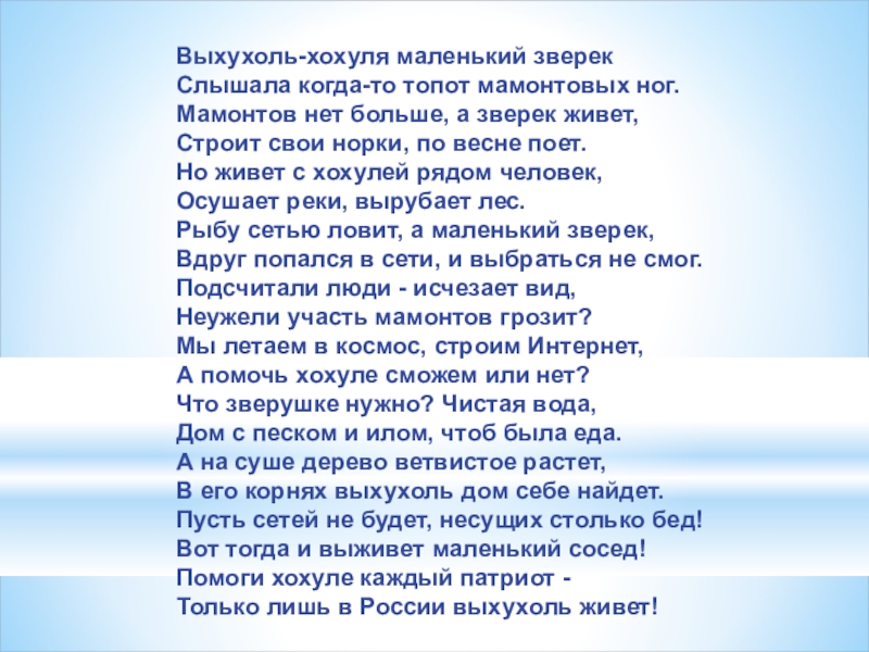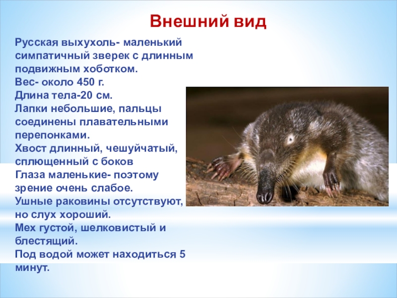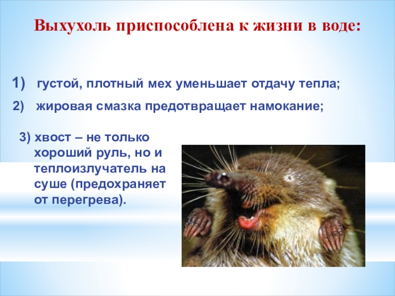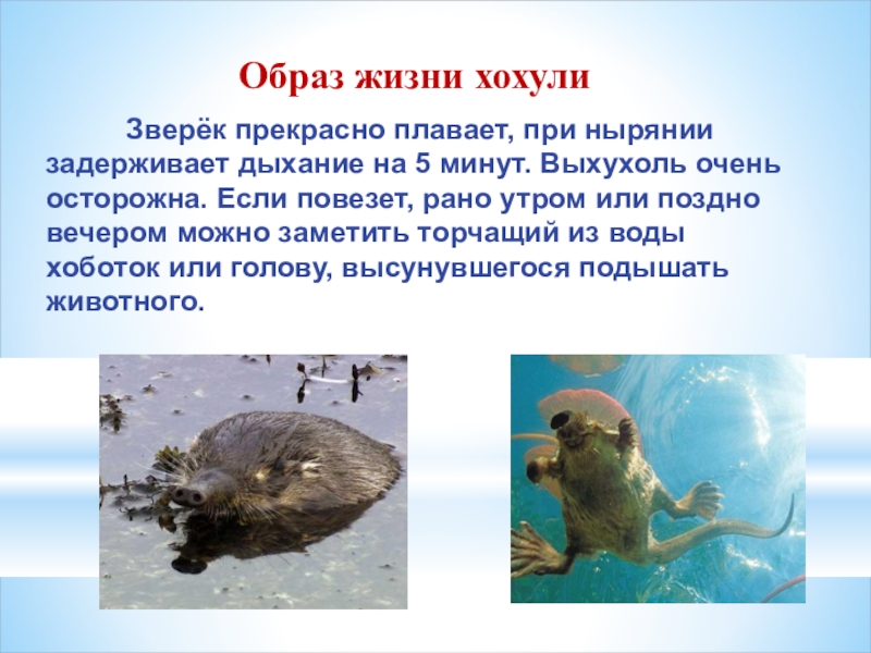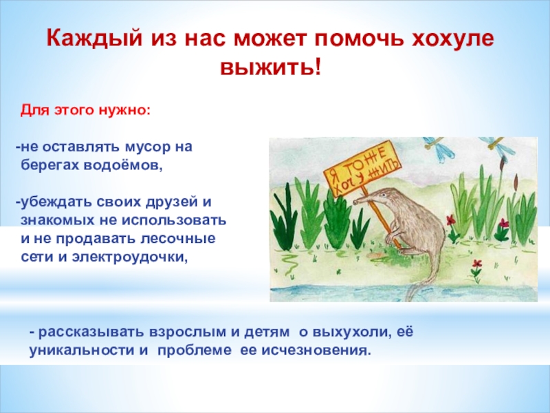 - рассказывать взрослым и детям о выхухоли, её уникальности и проблеме ее исчезновения.