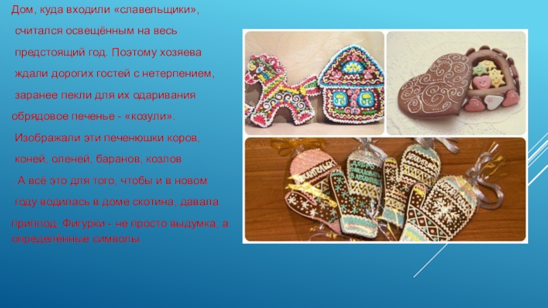 Хозяева одаривали колядующих, подавая мальчикам «бычков», а девочкам «коровок». Обрядовый магический смысл печенья подчёркивают украшающие его знаки Солнца – круги, кресты, свастика, которые вылепливались из того же теста, или наносились глазурью.