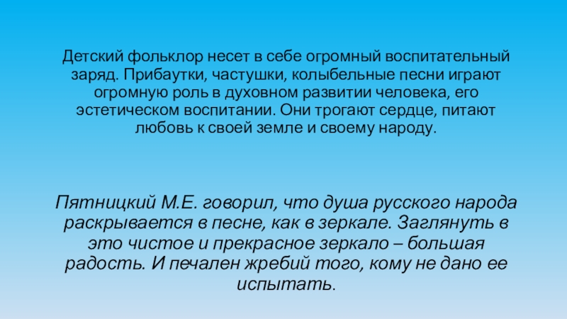 Детский фольклор несет в себе огромный воспитательный заряд. Прибаутки, частушки, колыбельные песни играют огромную роль в духовном развитии человека, его эстетическом воспитании. Они трогают сердце, питают любовь к своей земле и своему народу. Пятницкий