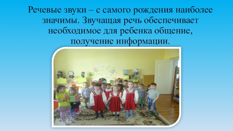 Речевые звуки – с самого рождения наиболее значимы. Звучащая речь обеспечивает необходимое для ребенка общение, получение информации.