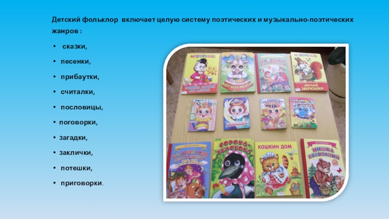 Слайд 6Детский фольклор включает целую систему поэтических и музыкально-поэтических жанров :