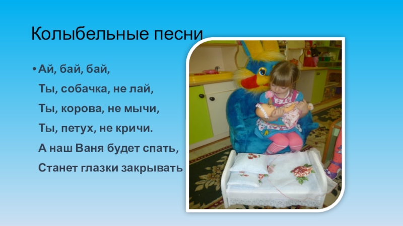 Колыбельные песниАй, бай, бай, Ты, собачка, не лай, Ты, корова, не мычи, Ты, петух, не кричи. А