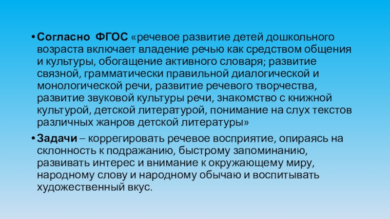 Слайд 4Согласно ФГОС «речевое развитие детей дошкольного возраста включает владение речью как
