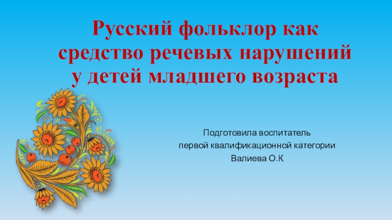 Русский фольклор как средство речевых нарушений у детей младшего возраста Подготовила воспитатель первой квалификационной категорииВалиева О.К