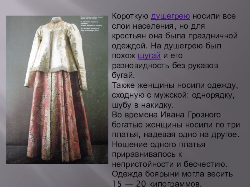 Во времена Ивана Грозного богатые женщины носили по три платья, надевая одно на другое. Ношение одного платья приравнивалось к непристойности и бесчестию. Одежда боярыни могла весить 15 — 20 килограммов.