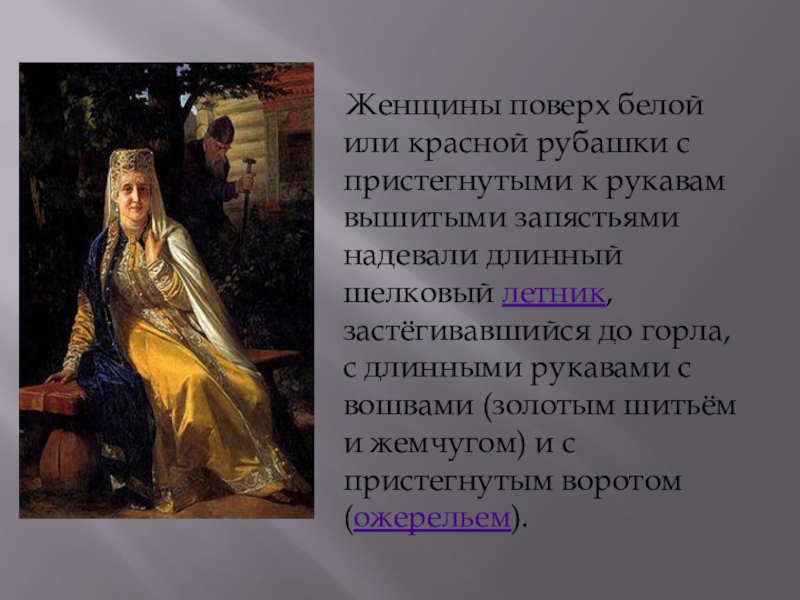 к рукавам вышитыми запястьями надевали длинный шелковый летник, застёгивавшийся до горла, с длинными рукавами с вошвами (золотым шитьём и жемчугом) и с пристегнутым воротом(ожерельем).