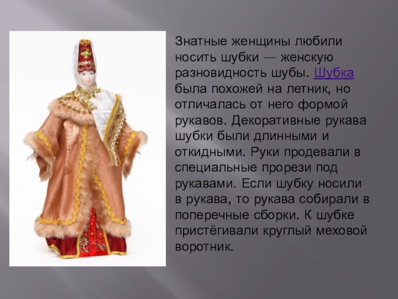 Слайд 6Знатные женщины любили носить шубки — женскую разновидность шубы. Шубка была похожей