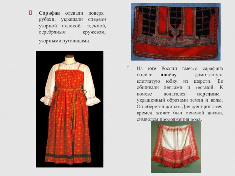 На юге России вместо сарафана носили понёву – домотканую клетчатую юбку из шерсти. Ее обшивали лентами и тесьмой. К поневе полагался передник, украшенный образами земли и воды. Он оберегал живот. Для женщины тех времен живот был основой жизни, символом продолжения рода.