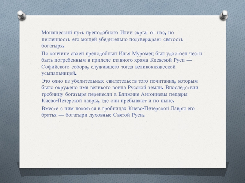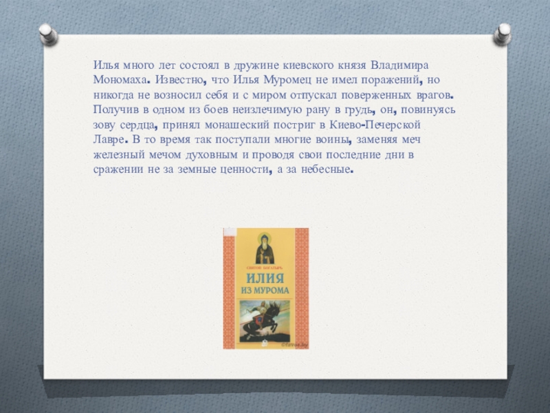 что Илья Муромец не имел поражений, но никогда не возносил себя и с миром отпускал поверженных врагов. Получив в одном из боев неизлечимую рану в грудь, он, повинуясь зову сердца, принял монашеский постриг в Киево-Печерской Лавре. В то время так поступали многие воины, заменяя меч железный мечом духовным и проводя свои последние дни в сражении не за земные ценности, а за небесные.