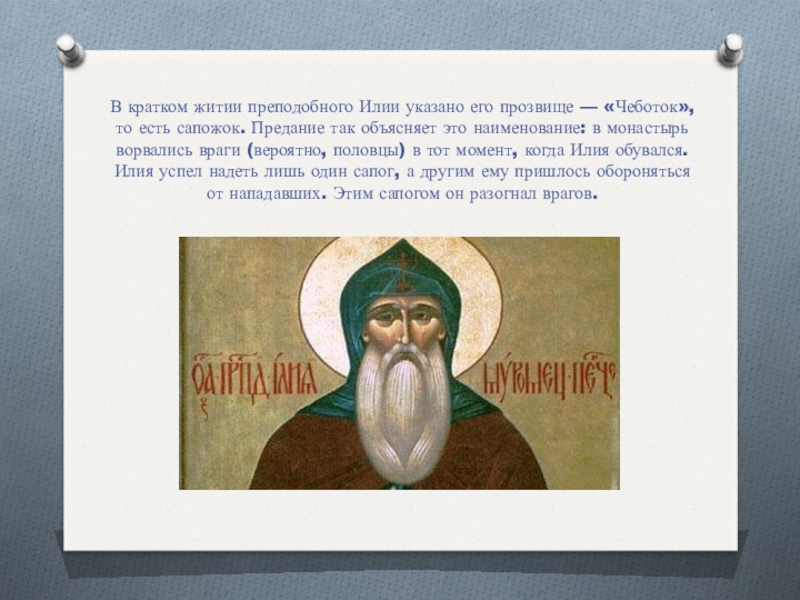 В кратком житии преподобного Илии указано его прозвище — «Чеботок», то