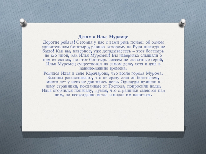 речь пойдет об одном удивительном богатыре, равных которому на Руси никогда не было! Как вы, наверное, уже догадываетесь – этот богатырь не кто иной, как Илья Муромец! Вы наверняка слышали о нем из сказок, но этот богатырь совсем не сказочные герой, Илья Муромец существовал на самом деле, хотя и жил в давние-давние времена.