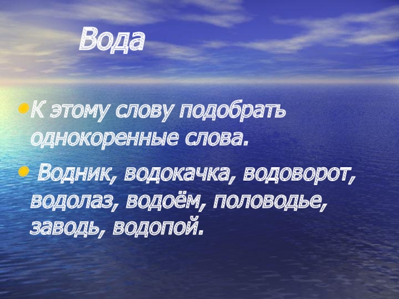 Вода К этому слову подобрать однокоренные слова. Водник, водокачка, водоворот, водолаз, водоём, половодье, заводь, водопой.