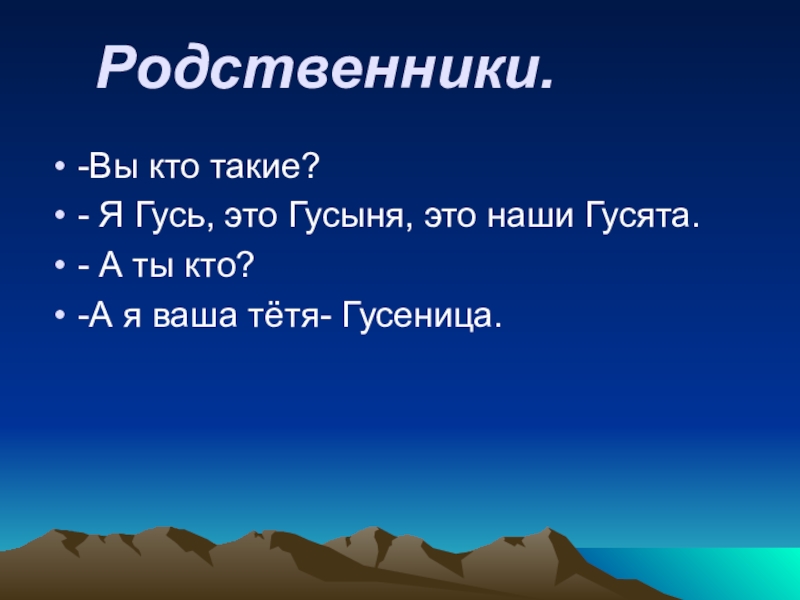 Родственники. -Вы кто такие?- Я Гусь, это Гусыня, это наши Гусята.- А ты кто?-А я ваша тётя-
