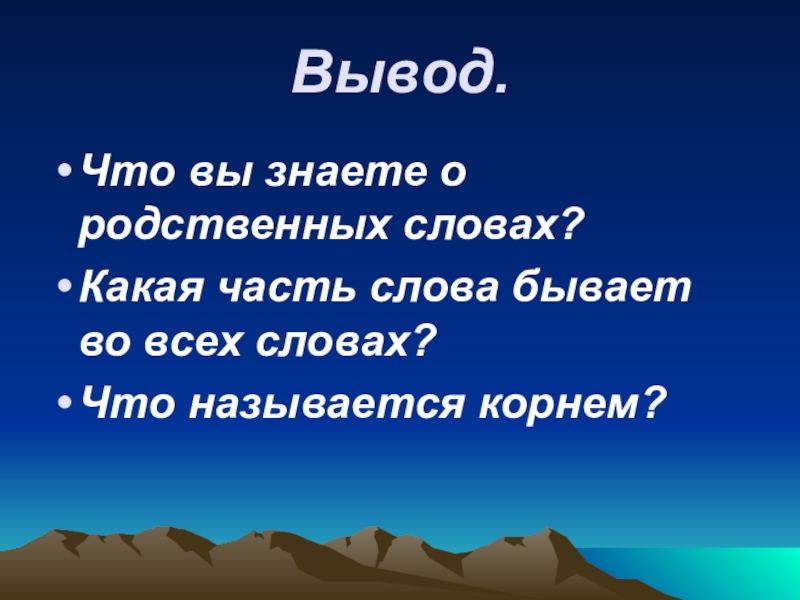 Вывод. Что вы знаете о родственных словах?Какая часть слова бывает во всех словах?Что называется корнем?