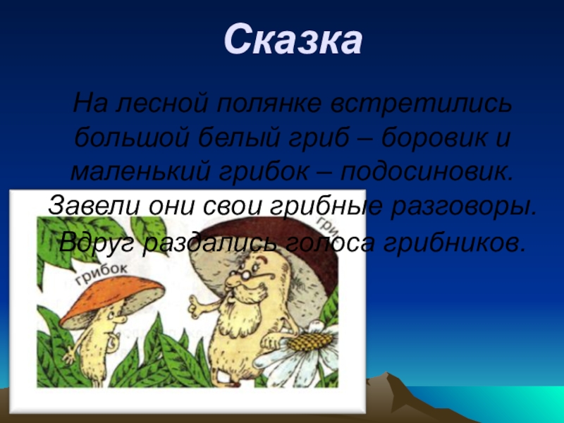 Сказка   На лесной полянке встретились большой белый гриб – боровик и маленький грибок – подосиновик.