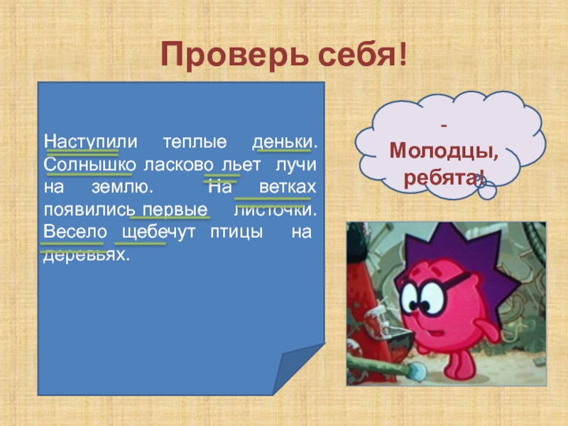 Наступили теплые деньки. Солнышко ласково льет лучи на землю. На ветках появились первые листочки. Весело щебечут птицы на деревьях.