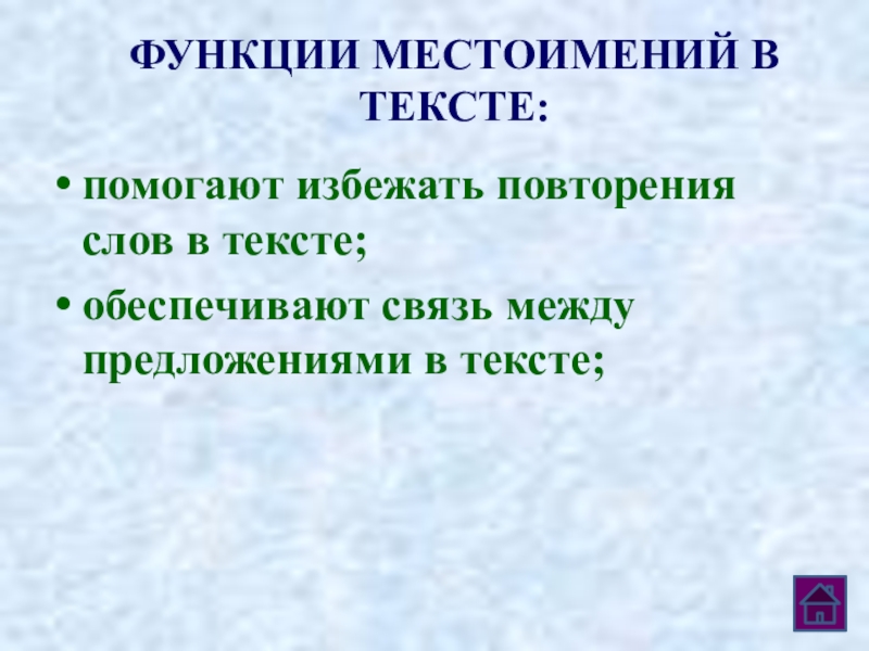 ФУНКЦИИ МЕСТОИМЕНИЙ В ТЕКСТЕ:помогают избежать повторения слов в тексте;обеспечивают связь между предложениями в тексте;