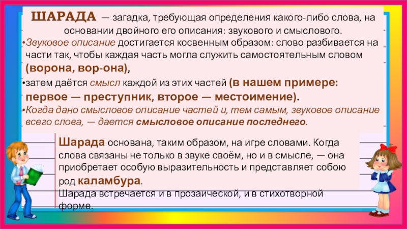 Шарада основана, таким образом, на игре словами. Когда слова связаны не только в звуке своём, но и в смысле, — она приобретает особую выразительность и представляет собою род каламбура.