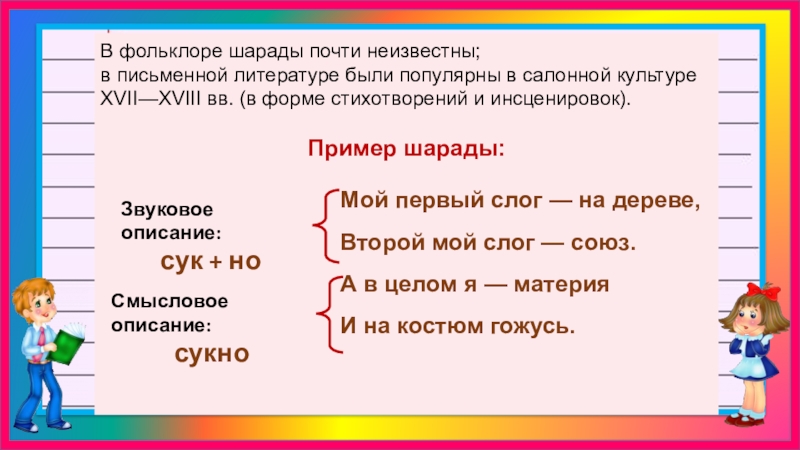 Шарада встречается и в прозаической, и в стихотворной форме.