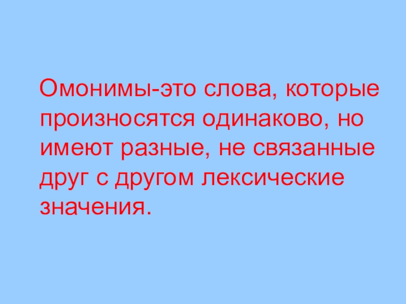 Омонимы-это слова, которые произносятся одинаково, но имеют разные, не связанные друг с другом лексические значения.