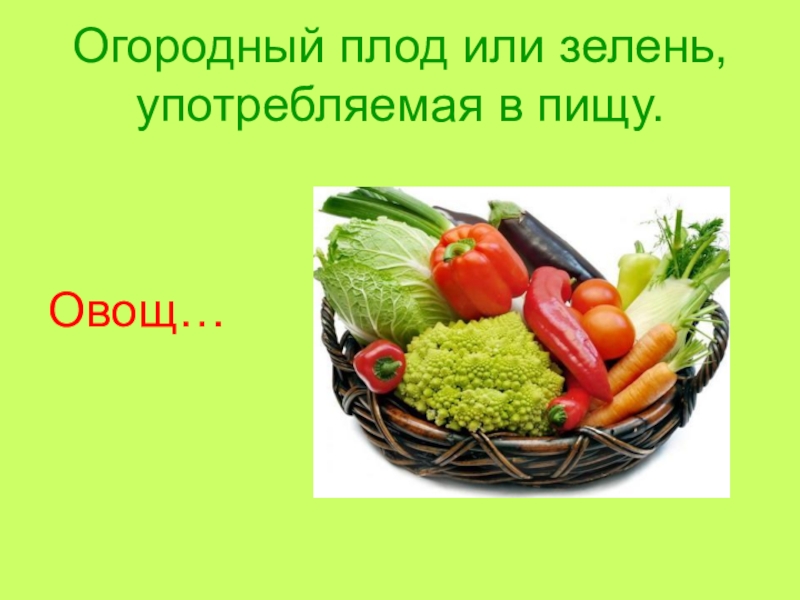 Огородный плод или зелень, употребляемая в пищу.Овощ…