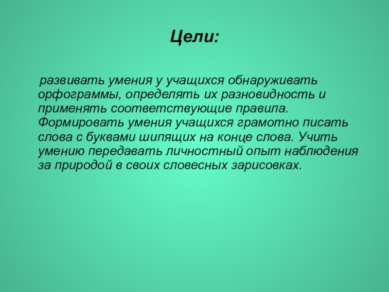 их разновидность и применять соответствующие правила. Формировать умения учащихся грамотно писать слова с буквами шипящих на конце слова. Учить умению передавать личностный опыт наблюдения за природой в своих словесных зарисовках.
