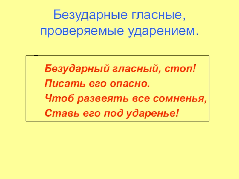 Безударные гласные, проверяемые ударением.Безударный гласный, стоп!Писать его опасно.Чтоб развеять все сомненья, Ставь его под ударенье!