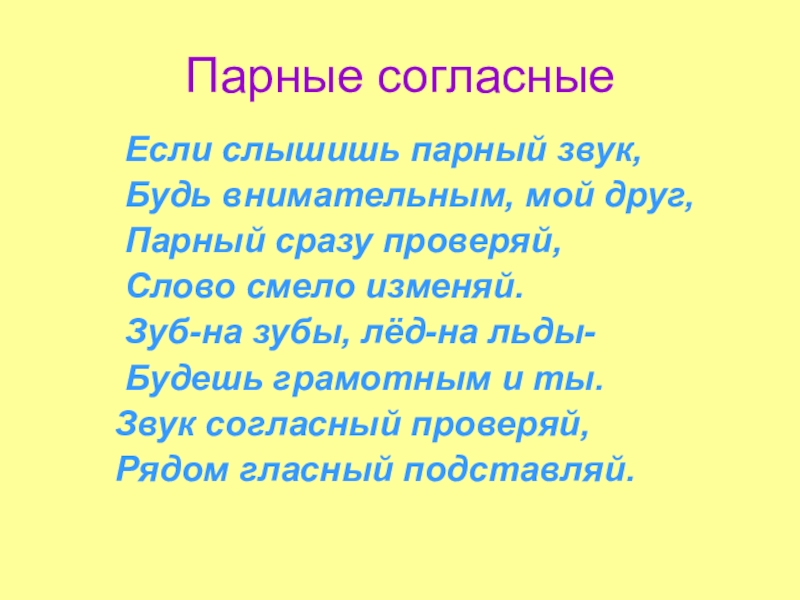 Парные согласные Если слышишь парный звук, Будь внимательным, мой друг, Парный сразу проверяй, Слово смело изменяй. Зуб-на