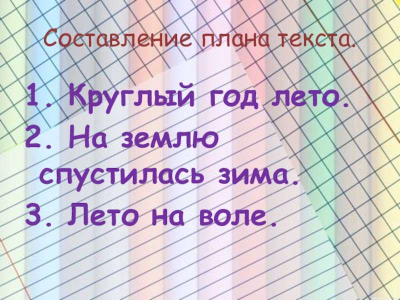 Составление плана текста.1. Круглый год лето.2. На землю спустилась зима.3. Лето на воле.
