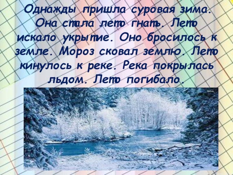 Однажды пришла суровая зима. Она стала лето гнать. Лето искало укрытие. Оно бросилось к земле. Мороз сковал