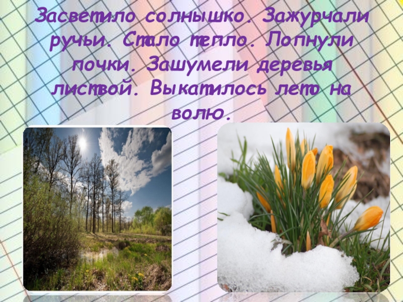 Слайд 8Засветило солнышко. Зажурчали ручьи. Стало тепло. Лопнули почки. Зашумели деревья листвой.